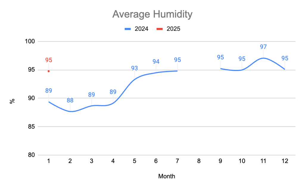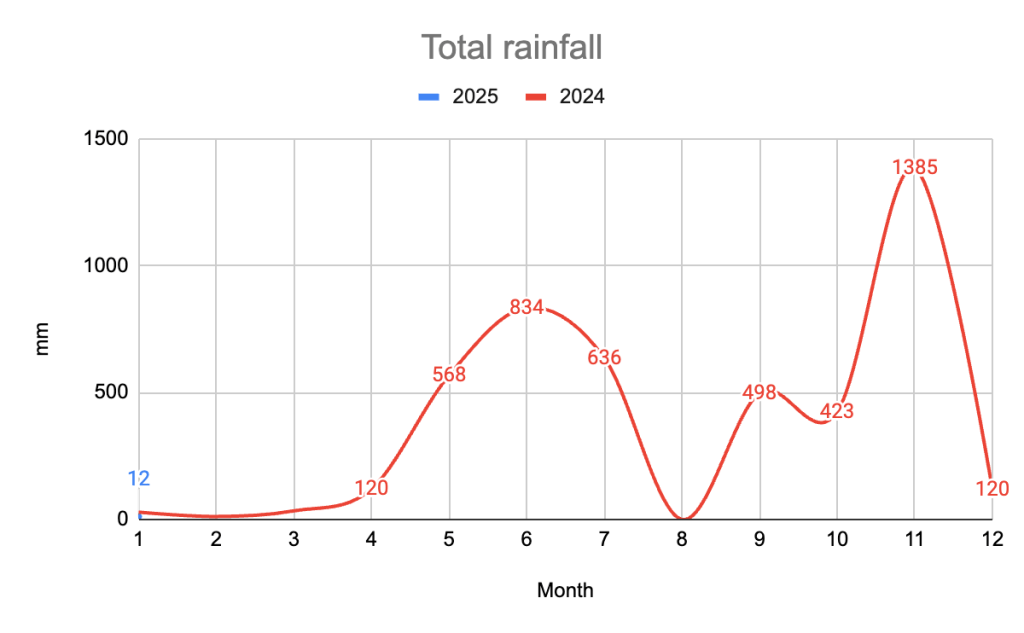 Three and a half years later, we can confirm that that early impression was correct. In fact, surprised by so much water moving around here, we decided to start measuring it. We bought a weather station (which we named ARTURITO, in memory of Luke Skywalker’s loyal friend in Star Wars: R2-D2), and our beloved friend Jan, CALTEC’s scientist & guitarist, configured and installed it. That was in mid-January 2024. Well, a year has passed since then, and we have now objective results that we are eager to share.