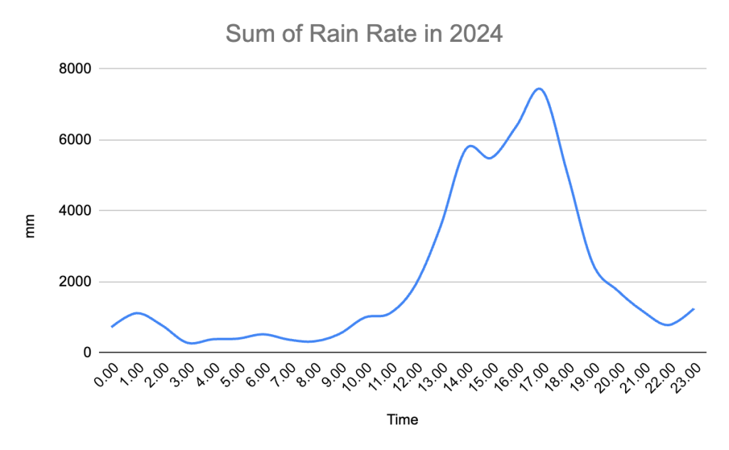 When I complain about so much water, my neighbors usually console me by saying: “…but it only rains in the afternoons”. And indeed, the data confirms it with absolute clarity, here in Babylon Gardens it mostly rains from 14:00 to 18:00. To reassure the workaholics, our working day (…the theoretical one) is from 06:00 to 15:00. So, it’s just what you’re thinking: the rain gets us wet in our “free” hours.