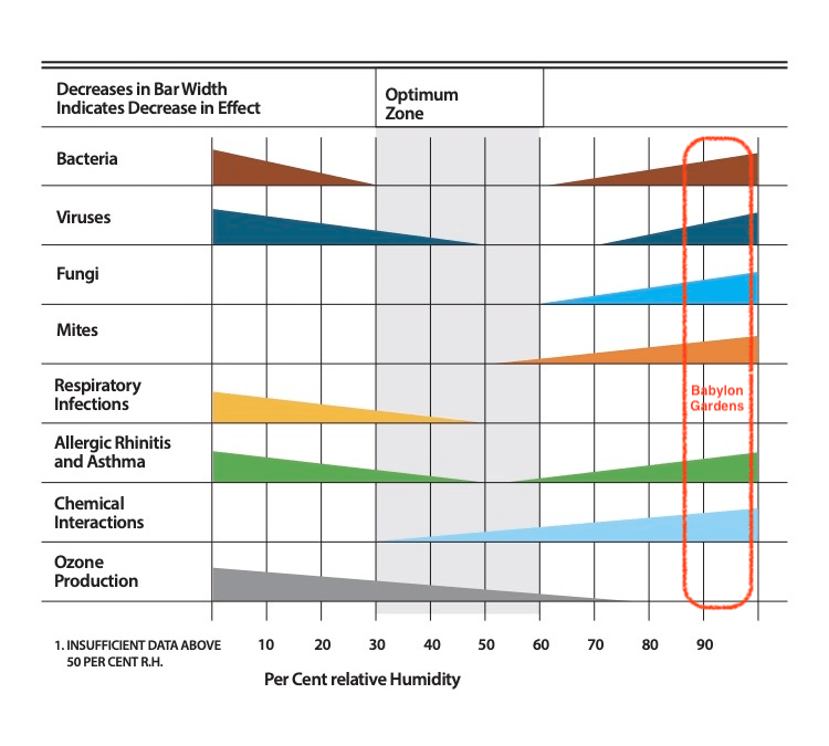 …However, in all honesty, that does not correspond to what we always felt, and all too often the atmosphere was stuffy. How can this be explained? By the relative humidity that we have here, which is extremely high! Around 93% in average! That is to say, in Babylon Gardens, not only does it rain a lot, but the very air is saturated with water!